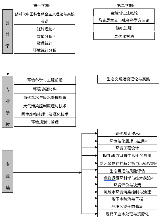 本着培养环境科学和工程相关教学、科研、管理和应用的专业高级人才的宗旨,确定一套科学合理的课程体系,基础课与专业课比例恰当合理,课程内容设计和安排将学科基础性和发展的前沿性并重。