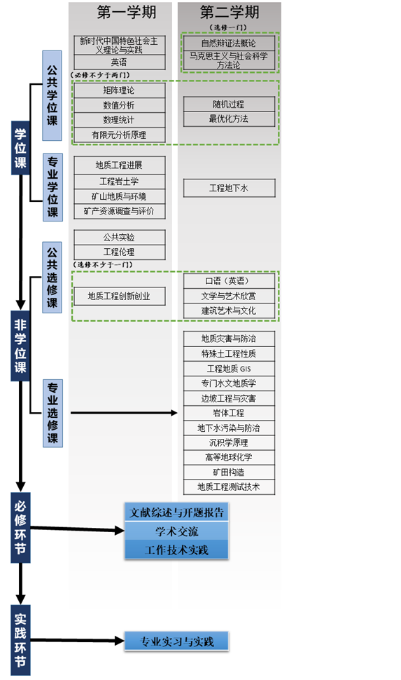 对于跨专业录取的硕士研究生,必须补修至少2门本专业本科核心课程,并通过考试,但不计学分。可选择的补修本科核心课程包括:土质学与土力学、岩体力学与工程、工程地质学、工程地质勘察、地基处理(I)、混凝土结构原理、水文地质学基础、地下水动力学、基础工程、构造地质学、矿物学、沉积岩石学、岩浆岩石学、地球化学、地史学。