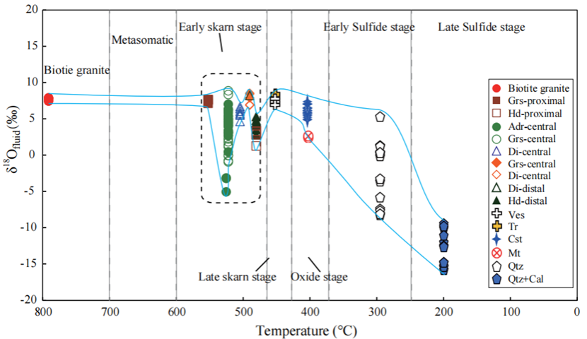 矽卡岩型矿床是全球重要的钨、铜、铁、钼、锡、铅和锌等贱金属以及金和银等贵金属的重要来源。关于矽卡岩型矿床的相关研究众多,但是其成矿流体的来源和演化仍然存在着争议。周涛发教授团队通过对大兴安岭南段浩布高矽卡岩型锌铁锡矿床矽卡岩体系各阶段多种矿物相的原位SIMS氧同位素特征的研究,系统地记录了矽卡岩体系中成矿流体的来源和形成条件。