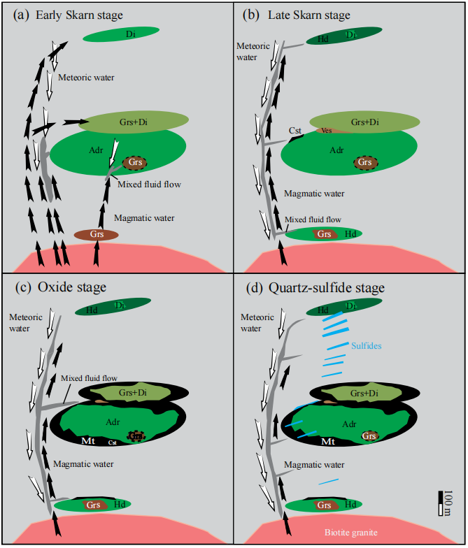 论文取得以下主要认识:(1)浩布高矿床中石榴子石形成于岩浆流体和大气水的混合流体中,流体混合在矽卡岩形成的早阶段已经发生。(2)浩布高矿床发育了多阶段的流体,矽卡岩矿物的氧同位素特征记录了岩浆流体具有幕式脉冲的特点。垂向上,大气水不具有深度越浅,占比越多的特征,中部矽卡岩显示了复杂的流体混合特征。(3)浩布高矿床热液体系中具有波动的岩浆流体和大气水的贡献,硫化物阶段大气水的加入与铅锌矿化沉淀具有密切关系。