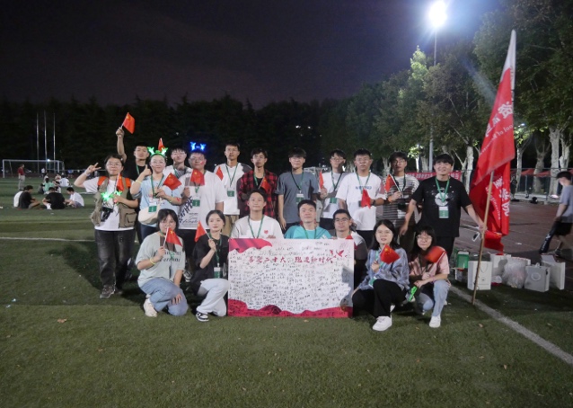 活动前期,研会同学有序组织展板签到、预跑热身、发放荧光设备与手摇国旗,并在操场上摆出“1921”、“2022”等字样,欢度国庆。参赛同学准时集合,大家拉起横幅、举起院旗,留下珍贵合影。