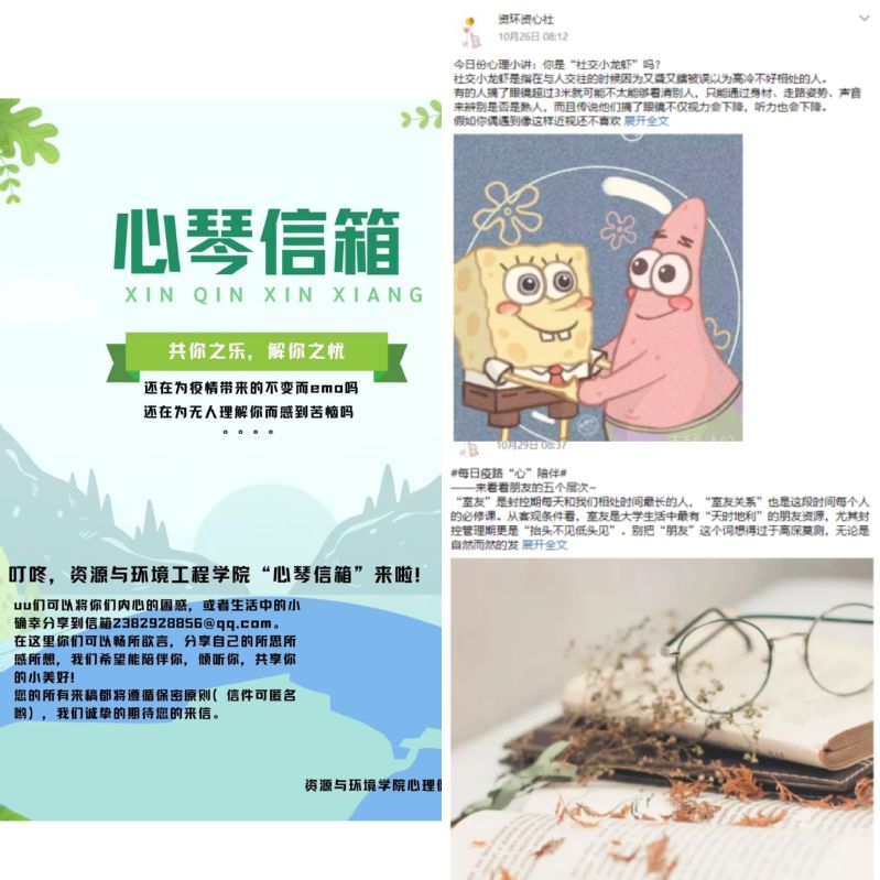 10月底至11月初,资心社利用官方宣传平台转载推送“每日疫路‘心’陪伴”等一系列疫情期间心理健康防护主题网络文化作品,帮助同学们掌握心理调适方法,积极应对生活。