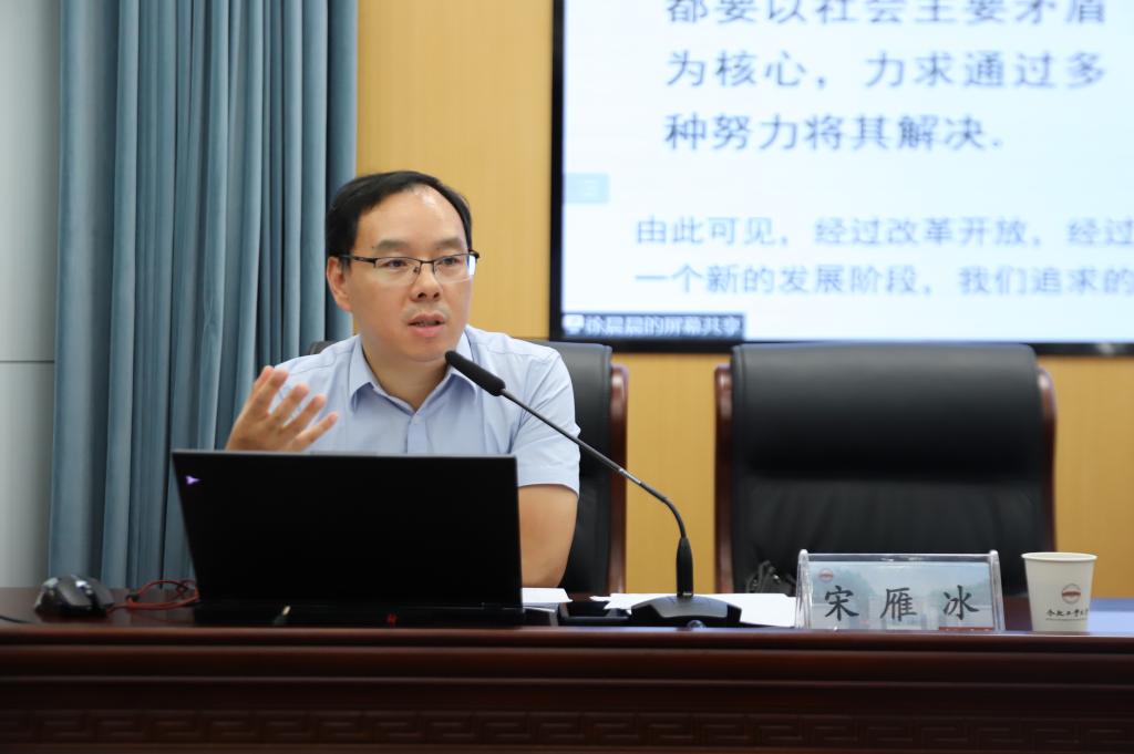 为迎接宣传党的二十大,坚定新生理想信念,厚植新生爱国爱党情怀,365best体育亚洲官网于9月15日晚,线上线下同步开展新生主题教育系列活动之理想信念教育第一课。安徽省委讲师团办公室副主任宋雁冰受邀讲课,学院相关领导、辅导员、2022级全体新生参加活动。活动由学院党委副书记兼纪委书记鲍丽娟主持。