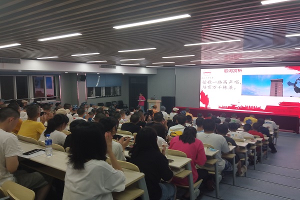 随后,学生会大二年级地理信息科学专业的王晨雨同学带领新生赏析校歌歌词,详细解释了每句歌词的由来和背景意义,并教授了一些校歌歌唱的基本技巧。最后,全体大一新生齐唱365best体育亚洲官网校歌,以青春之歌奏响多彩大学生活。
