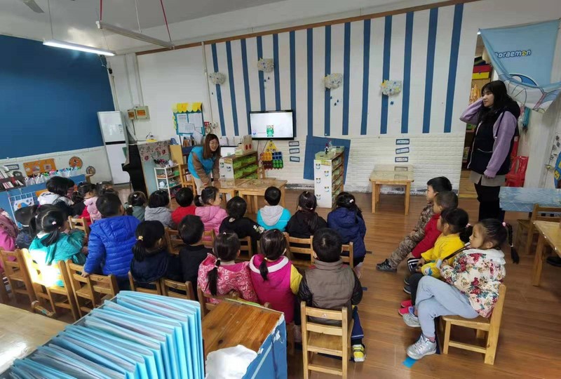 本次的义务教学活动主要分为两个阶段,在来到幼儿园与中一班的授课老师做简短的交流之后,首先由研会干事田雪滢同学向小朋友们介绍关于垃圾分类的知识。教学主要以图片与视频的方式,通过各种各样的卡通图案,形象生动的向小朋友们介绍了关于垃圾污染的危害、垃圾桶的种类以及各种不同垃圾的分类。并加以提问的方式让小朋友们积极的参与进来,加强了小朋友们的理解。