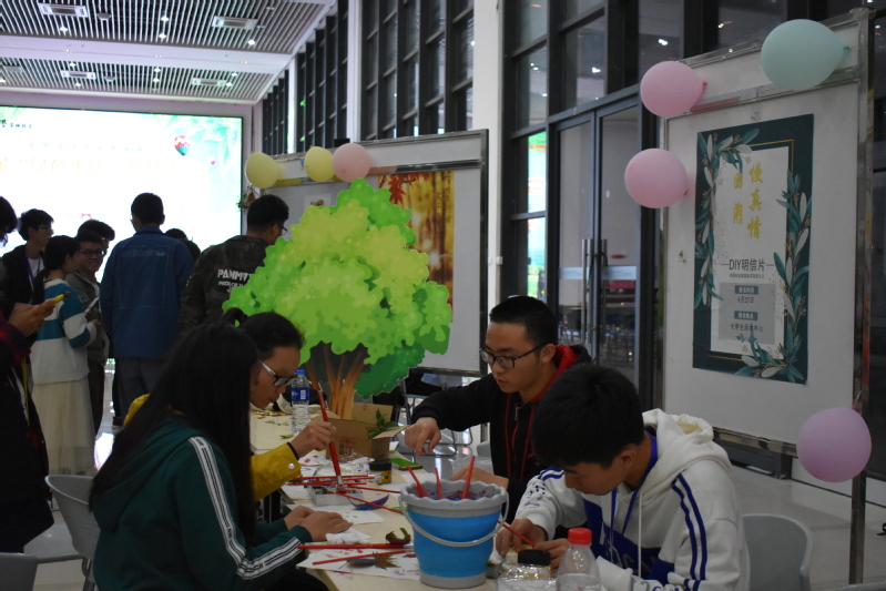 “传创新精神,显环保意识”问答环节结束后,各展区纷纷热闹起来,人头攒动。落叶传情,落叶不归根,DIY自制明信片等一系列丰富的活动激发起大家的创作兴趣。以落叶为素材,以叶作画,创造富有想象力的手工作品,利用植物叶片DIY绿色明信片,将自己的祝愿写在落叶上,制作属于自己的绿色明信片现场投递于邮箱,将美好的祝福送予亲人、朋友。大家制作的作品各具特色,内涵丰富,用不一样的方式向同学们传递了环保的信息,展现了校区学子深厚的人文素养和勇于创新的精神面貌。