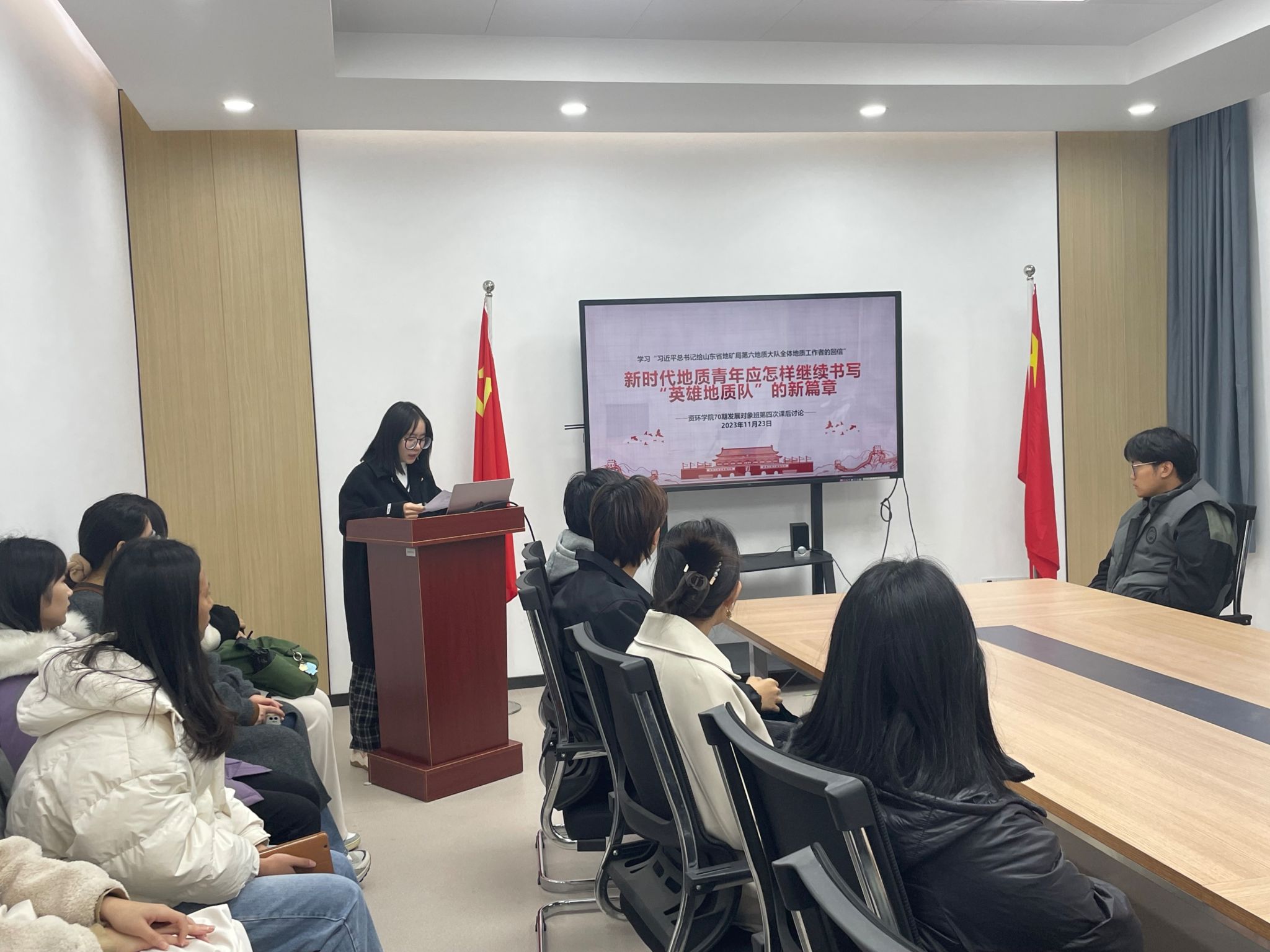 在本次讨论中,发展对象班学员们结合专业所学及对地质工作的所见所闻,各抒己见,畅所欲言。学员周佳晨同学在讨论时说到:“在这个波澜壮阔的新时代里,作为一名地质人,我们深感责任重大,时刻准备为书写‘英雄地质队’新篇章贡献力量。这封深情且鼓舞人心的信件,不仅是对我们以往成就的肯定,更是对未来挑战的号召。正如古语所言,‘不积跬步,无以至千里’,我们每一次的勘探和努力,都是通向成功的重要步骤。”