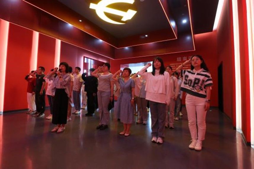 师生党员在教育馆序厅观看了《永远在路上》专题片,在讲解员的带领下,依次参观了“纪律立党·全面从严治党”、“廉润江淮·清风扬帆”、“以案为鉴·警钟长鸣”、“不忘初心·永葆清廉”四个展厅。展厅通过展板、图片、视频、雕塑、互动体验、场景还原等多种形式,全方位展示中国共产党筚路蓝缕的百年纪律建设史,展现我省全面从严治党、党风廉政建设和反腐败斗争的工作成效。一件件让人触动深刻的警示案例,让全体人员全面接受了一次触及灵魂的教育。在教育馆宣誓厅,在学院党委副书记、纪委书记鲍丽娟领誓下,全体党员面对鲜红的党旗,举起右拳,重温了入党誓词,牢记在党旗下的铮铮誓言。