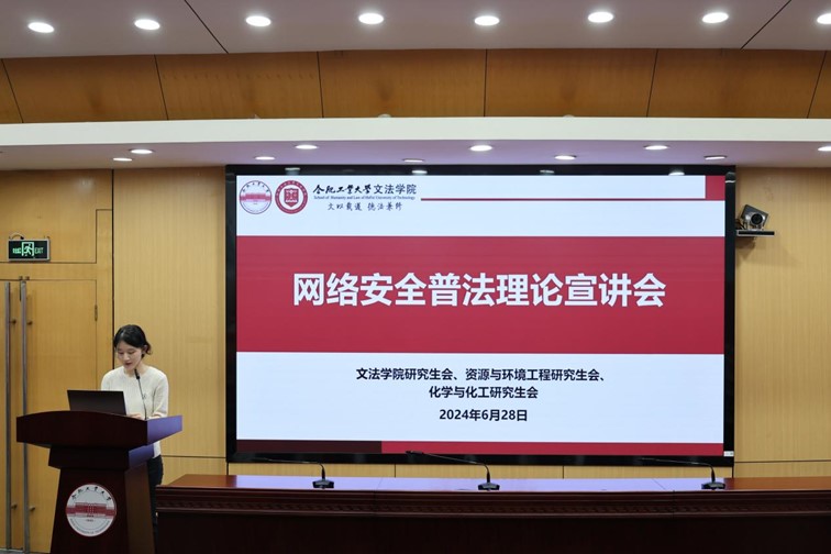 为进一步提高研究生对网络安全的认识,增强全民法治观念、网络安全意识和防护能力,6月28日下午,365best体育亚洲官网、文法学院、化学与化工学院在学术会议中心第二报告厅共同举办了网络安全普法活动。本次活动由文法学院普法宣传团成员胡京京同学与郑思怡同学主讲,资环学院、化工学院八十余名研究生参加。