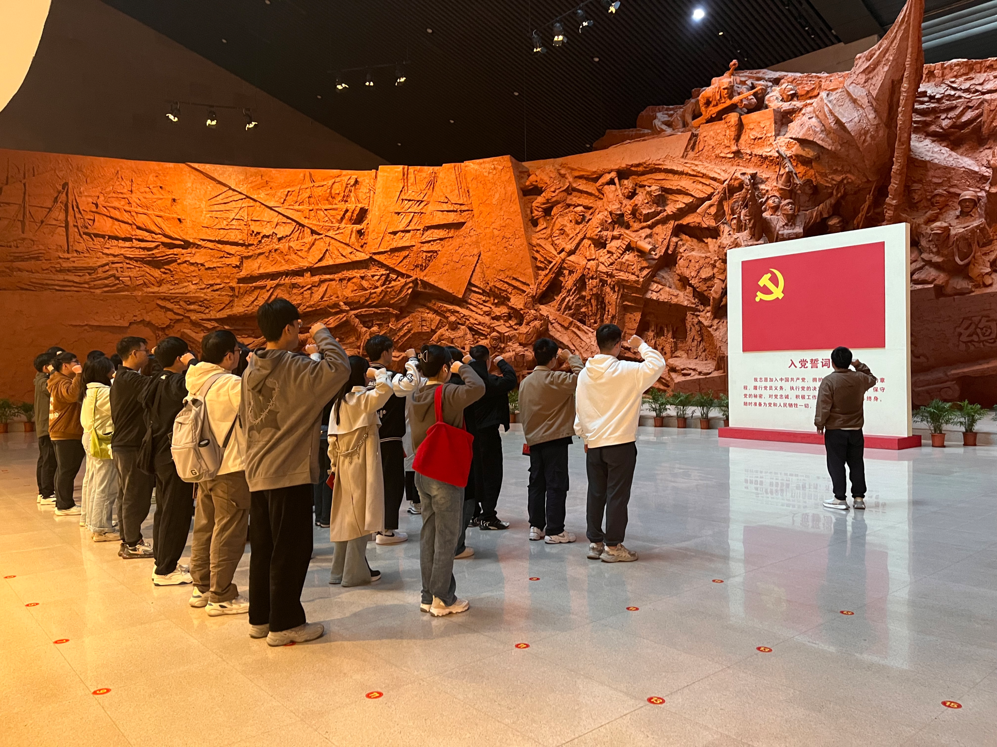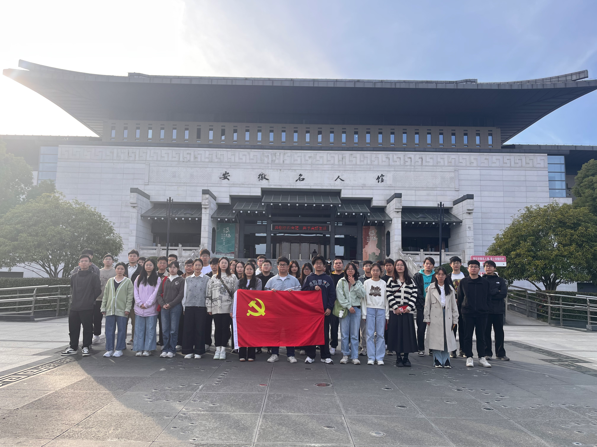党支部成员首先来到了渡江战役纪念馆。这座纪念馆位于长江以北,巢湖之畔,外观巍峨耸立,仿佛一艘帆船奔向长江。支部成员们在纪念馆序厅主题群雕前重温入党誓词,忆初心使命,强理想信念,践责任担当,添前行力量。随后,大家依次参观了“战前形势”“战役准备”“突破江防”“战役胜利”“人民支前”“英雄业绩”六个展厅。通过情景再现和相关文物、图片及视频资料的展示,同学们深刻感受到了渡江战役的艰险不易和人民解放军勇渡长江的英雄气魄,体悟到了军民齐心、改天换地,把浩荡长江变成阳关大道的人民伟力。紧接着,支部党员们来到了堪称安徽名人的“百科全书”——安徽名人馆。在这里,同学们了解了一代又一代勤劳智慧的江淮人民,以及一批批在历史上留下深刻印记的安徽杰出人物的生平事迹和卓越贡献。