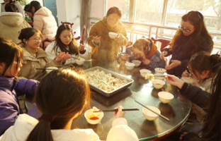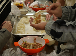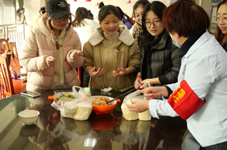 活动中,工作人员为同学们准备了新鲜的饺子皮和馅料,食堂阿姨也亲切细心地为不熟悉包饺子的同学进行教学。大家分组围坐在一起,分享包饺子的小经验和小技巧,在一片欢声笑语的气氛中,亲手捏出一个个极具特色的饺子。在大家共同劳动下,面前的馅料很快见底,取而代之的是一盘盘满满当当、圆圆鼓鼓的饺子。待饺子煮熟后,大家享受着自己的劳动成果,分享着自己调制的不同的蘸料,每一个饺子都蕴含着对同学们满满的祝福。