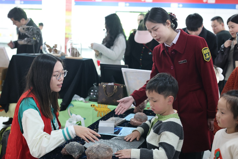 展览旨在通过沉浸式科普体验,激发公众尤其是青少年对地质科学的兴趣,强化自然资源保护意识。活动现场陈列鱼龙、恐龙蛋、鱼等珍贵化石及模型10余件,学生志愿者结合化石小礼品赠送等趣味项目,为市民讲解地球演化史。孩子们一边聆听讲解员的介绍,一边仔细观察化石标本,共同探索地球的秘密。