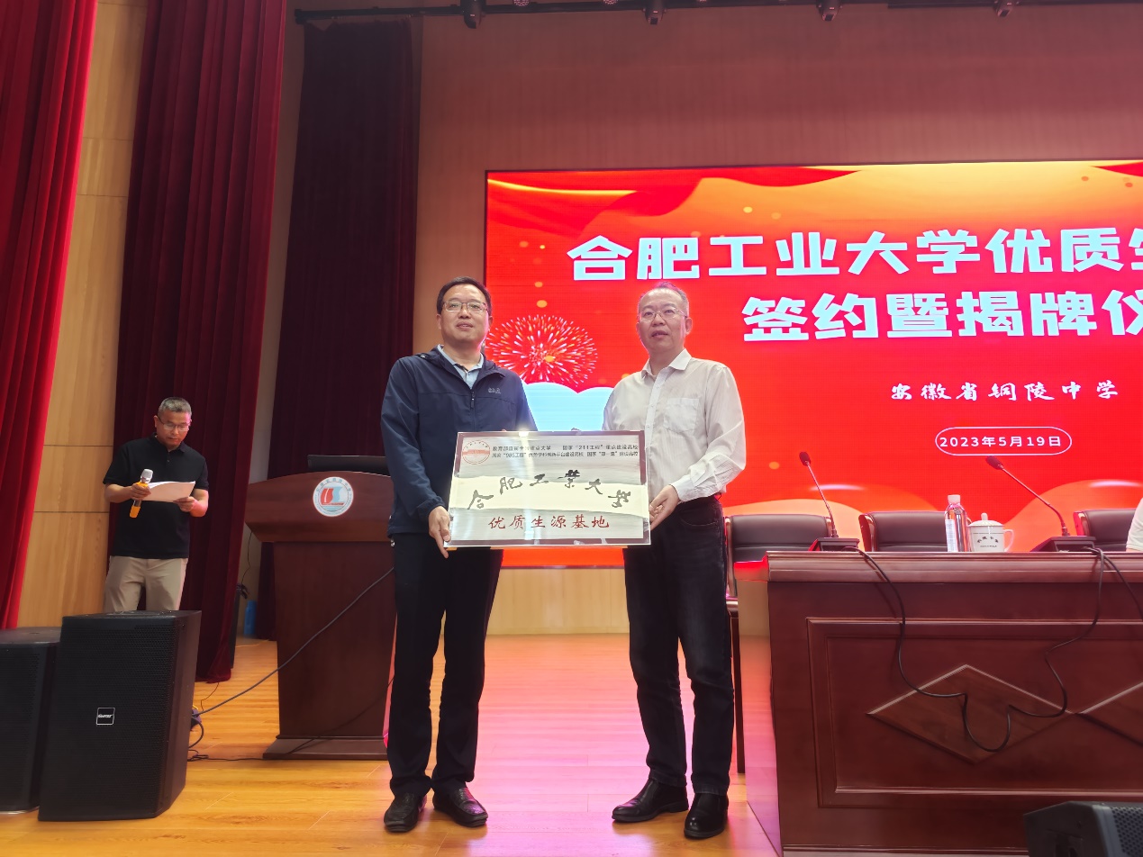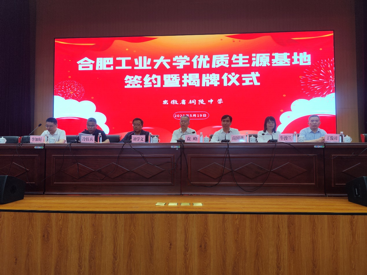 为不断扩大学校知名度,持续提升学校生源质量,5月19日,资源环境工程学院领导班子和本科招生宣传组一行赴铜陵开展365best体育亚洲官网与铜陵中学“优质生源基地”签约及揭牌仪式。资源环境工程学院院长袁峰、党委书记南国君、副院长牛漫兰、副处级组织员丁俊祥,铜陵中学党总支书记、校长夏劲云,党总支副书记刘学文,副校长冷红兵等出席签约揭牌仪式。
