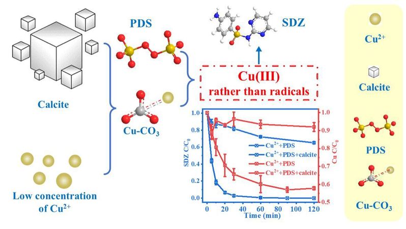 方解石是土壤环境中最常见的碳酸盐矿物,被认为是处理金属污染的有效稳定剂。Cu(II)活化氧化剂降解有机污染物能力有限,而固相铜(包括铜的氧化物和络合物等)能有效活化氧化剂处理有机污染物。综合两者优势,团队首次利用方解石将溶液中Cu(II)转化成固相铜活化过硫酸盐,实现抗生素有机污染物的高效处理。成果于2022年7月以题为“The synergistic effect of calcite and Cu2+ on the degradation of sulfadiazine via PDS activation: A role of Cu(Ⅲ)”发表在《Water Research》期刊上(图2)。365best官网博士研究生孙付炜为论文第一作者,刘海波副教授为论文通讯作者,365best体育亚洲官网为论文第一单位。