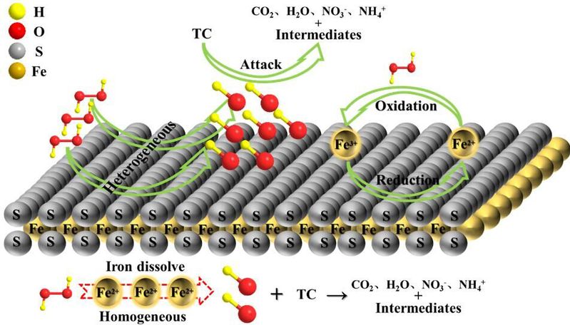 随着全球抗生素消费量迅速增长,大量未被利用的抗生素通过城市污水处理厂、雨水淋滤或堆肥处理等途径进入地表水、地下水及土壤,对人类健康和生态平衡构成巨大威胁。因成本低廉,操作简单等特点,以零价铁、氧化铁和负载型铁基为催化剂的非均相芬顿催化技术被广泛应用于抗生素处理,但仍存在催化剂电子选择性差、易产生铁泥、回收再利用困难等问题,直接增加有机废水处理成本。为解决上述问题,团队以天然纳米矿物—鲕状赤铁矿为前驱体,通过高温硫化方法,制备了具有多孔结构、高化学反应活性和可回收利用的磁性非均相催化剂,实现水体中四环素快速降解和矿化。成果于2020年1月以题为“Sulfurized oolitic hematite as a heterogeneous Fenton-like catalyst for tetracycline antibiotic degradation”发表在《Applied Catalysis B:environmental》期刊上(图4)。365best官网博士研究生王汉林为论文第一作者,刘海波副教授为论文通讯作者,365best体育亚洲官网为论文第一单位。