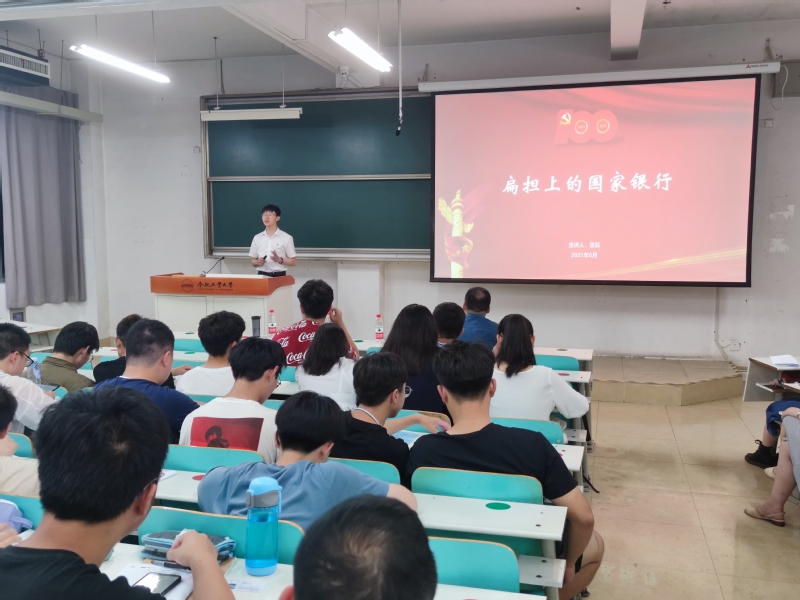 雷磊老师以“扁担上的国家银行”为主题进行宣讲。他以讲述历史上不同阶段的国家银行为主线,介绍了在中国共产党的百年征程中的红色金融。他呼吁同学们挑起肩上的“扁担”,继承和弘扬红色金融精神,脚踏实地,为国家的建设发展、为社会主义现代化建设贡献自己的青春力量。