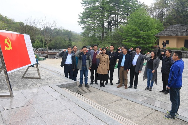 4月24日下午,环境系教工党支部与安徽省环保产业发展促进会党支部党员和入党积极分子及安徽省环保产业发展促进会部分会员单位企业家40余人,来到位于革命老区岳西县鹞落坪的红二十八军军政旧址,瞻仰烈士陵园,缅怀先烈们的英勇事迹,在烈士纪念碑前,面对鲜红的党旗,全体党员高举右手、握紧拳头,重温“我志愿加入中国共产党,拥护党的纲领,遵守党的章程……”入党誓词,铿锵的声音,表达了对党的无限忠诚。