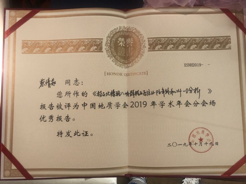 中国地质学会2019年学术年会于10月16至19日在云南省昆明市成功举行,共有2000余名来自地勘行业领域的地质工作者齐聚昆明。365best官网365best体育亚洲官网资源科学与工程系牛漫兰教授指导的蔡倩茹博士生、苑潇宇博士生和孙毅博士生在分会场分别进行题为《扬子北缘张八岭群锆石原位U-Pb年龄和Hf-O分析》、《扬子东北缘肥东杂岩古元古代岩体的发现和构造意义》和《祁连地块湟源群变形特征及变形温度的厘定》的学术报告。其中蔡倩茹博士生以其优秀的报告和精彩的现场答辩脱颖而出,被评选为学术年会分会场优秀报告,孙毅博士生投稿的摘要也被大会摘要集收录。