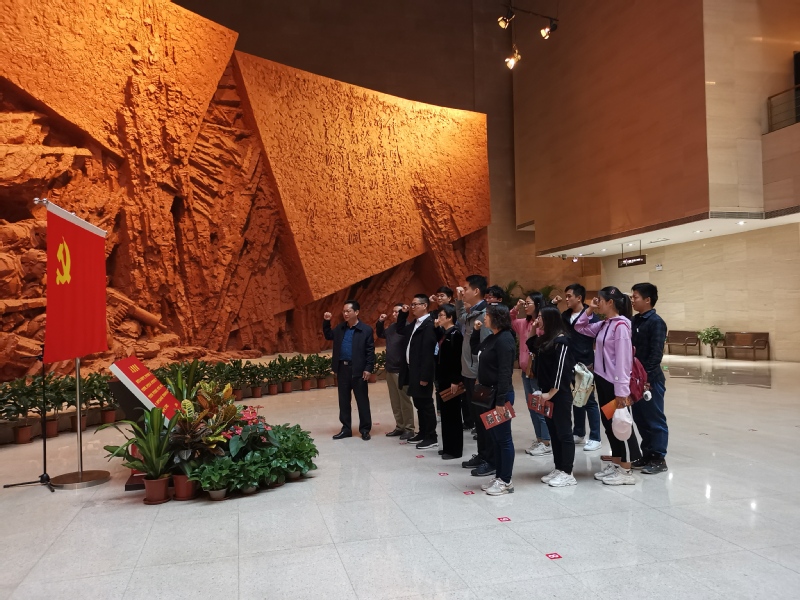 在安徽省合肥市滨湖新区的渡江战役纪念馆,老师和同学们参观了“为庆祝新中国成立70周年暨渡江战役胜利70周年”的专题展览。专题展览以“天翻地覆慨而慷”为主题、以渡江战役到新中国成立为时间主线,展示了七十年前那段血与火的革命历史。回顾历史,老师和同学们深深地被革命前辈英勇献身精神所感染。在渡江战役纪念馆序厅气势雄浑的浮雕《占领总统府》之下,在缀有镰刀锤子的鲜红党旗之前,全体党员举起右手、握紧拳头、庄严宣誓,重温入党誓词,激励支部党员“不忘入党初心,牢记党员使命”。正如习近平总书记指出:“我们走得再远都不能忘记来时的路。”