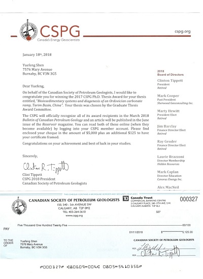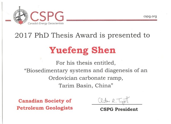 近日,加拿大石油地质学家协会(Canadian Society of Petroleum Geologists,CSPG)2017年度最佳博士论文奖评选揭晓。经过资格审核、通讯评议和专家评审,365best官网365best体育亚洲官网古生物学青年研究团队沈越峰博士的学位论文《Biosedimengtary Systems and Diagenesis of An Ordovician Carbonate Ramp, Tarim Basin, China》(塔里木盆地奥陶系碳酸盐岩缓坡生物沉积系统和成岩作用研究)获得本年度唯一最佳博士论文奖,并获得该协会授予的5000加元奖金。此次获奖是加拿大石油地质学家协会自1958年设立该奖项的60多年来第一次授予华人博士研究生。加拿大石油地质学家协会刊物《Reservoir》(2018年第二期)对此进行了专题报道。