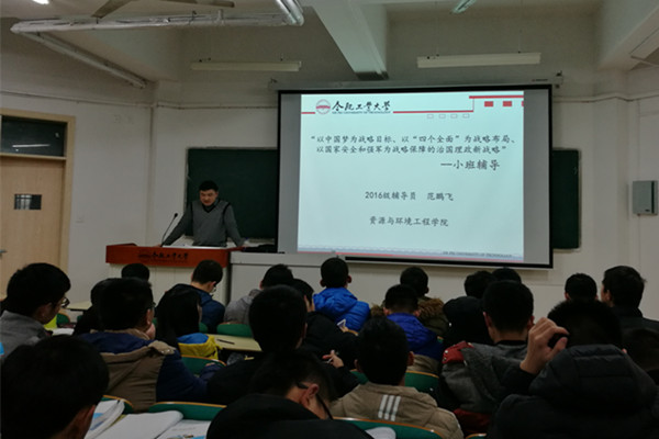 小班辅导方面,主要有“以为民为核心价值、以担当为政治责任、以发展为第一要务的治国理政新理念”,“以坚持和发展中国特色社会主义为主题、以总布局各领域创新理论为支撑的治国理政新思想”,“以中国梦为战略目标、以“四个全面”为战略布局、以国家安全和强军为战略保障的治国理政新战略”三个主题,辅导员紧密结合习近平总书记“七一”重要讲话精神和“两学一做”学习教育要求,通过讨论式、启发式、参与式的小班课堂向学生解读党中央治国理政新理念新思想新战略的时代背景、理论渊源、重大意义、理论品格、核心要义、精神实质、主要内容和科学内涵,深化青年学生对新理念新思想新战略的认识和理解,教育引导学生不断增强政治意识、大局意识、核心意识、看齐意识,坚定“四个自信”,为实现“两个一百年”奋斗目标和中华民族伟大复兴的中国梦而不懈奋斗。