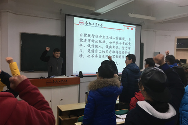 “明纪于心,诚实于行”学风考风教育主题班会上,辅导员对学校和学院有关考试规章制度及相关的处分办法做了详细的解读。结合以往的典型案例进行考试纪律教育,引导学生做到学业诚信、考试诚信、做人诚信。此外,辅导员带领学生庄重宣誓:“自觉践行社会主义核心价值观,自觉遵守考试纪律,公平参与考试竞争。诚信做人,诚实考试,努力学习,凭借自己的实力取得优秀的成绩,决不辜负老师和家长的信任。”
