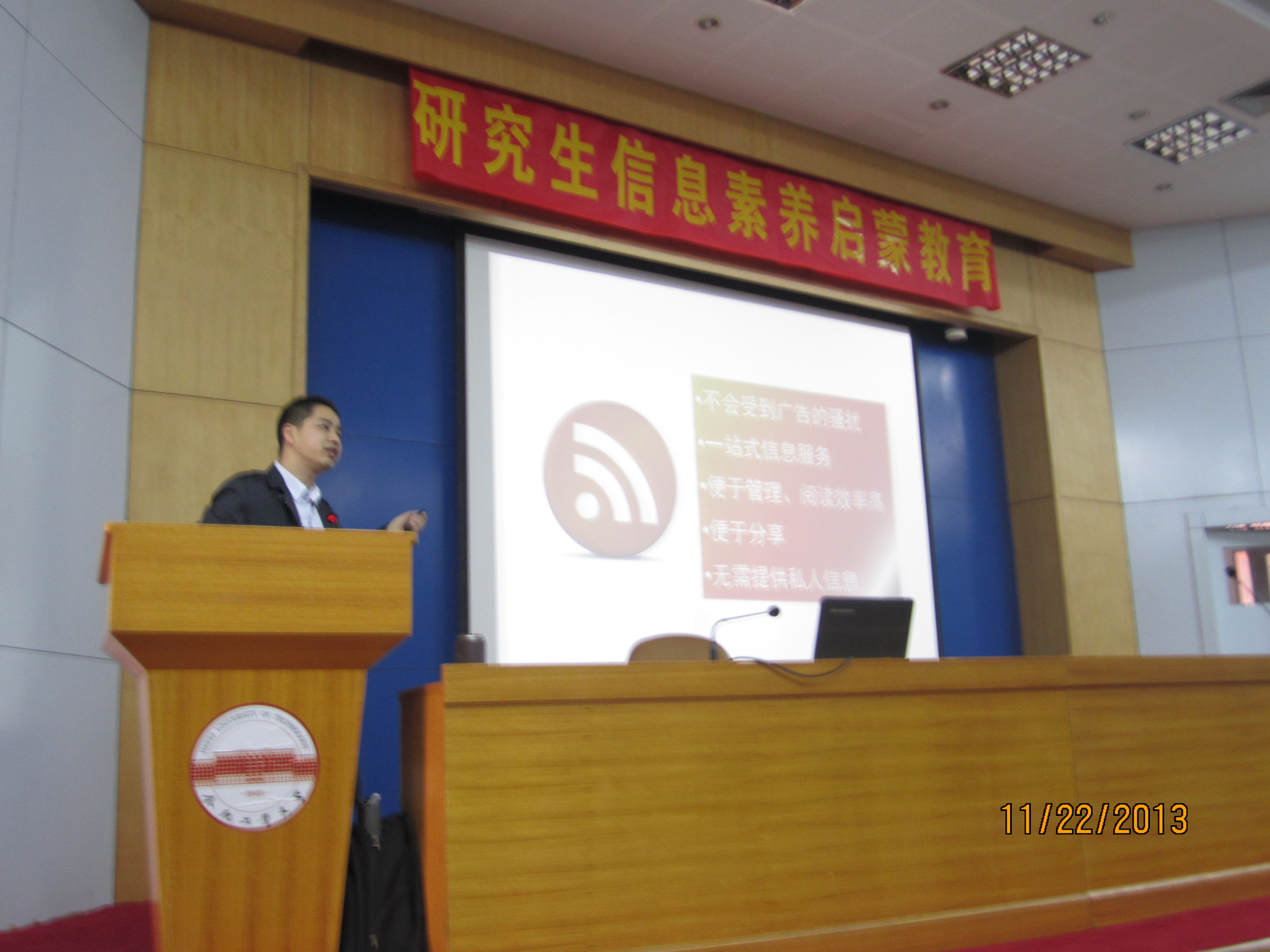 2013年11月22号星期五早上9点,由365best体育亚洲官网研究生会主办,365best体育亚洲官网图书馆信息咨询部承办的365best体育亚洲官网研究生信息素养教育启蒙系列活动在校学术会议中心拉开帷幕。图书馆信息咨询部张仁琼主任,冯琳老师,资环学院研究生辅导员张妍老师,本次主讲的中科大罗昭锋老师,校图书馆王磊老师等出席了开幕式。开幕式由资环研会主席谷小军主持。