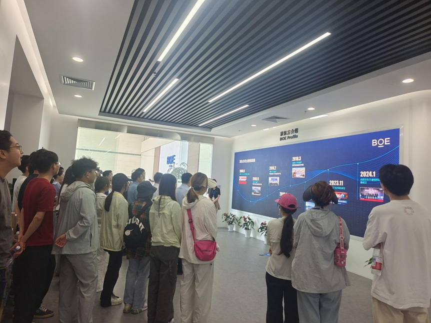 师生一行先后参观了京东方创新技术展厅、工艺流程墙和工艺走廊。在参观过程中,师生们深入了解了京东方在资源利用与环境管理方面的先进理念与实践成果。在创新技术展厅,同学们不仅看到了各类高科技显示面板,还了解到京东方如何在产品设计与生产过程中贯彻绿色制造理念,通过优化生产工艺、采用环保材料等方式,降低能源消耗与废弃物排放,实现经济效益与环境效益的双赢。在工艺走廊,同学们目睹了第10.5代TFT-LCD生产线的高效运转,深刻体会到企业如何在追求技术创新的同时,通过严格的环境监测与资源回收利用体系,确保生产过程对环境的友好性。
